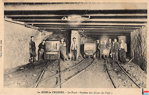 La mine de Crusnes - Le fond - Entrée des gares du Puits I, vers 1932 (Carte postale: Photo Prillot, Metz; Collection: industrie.lu)