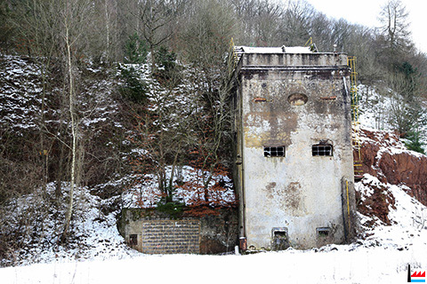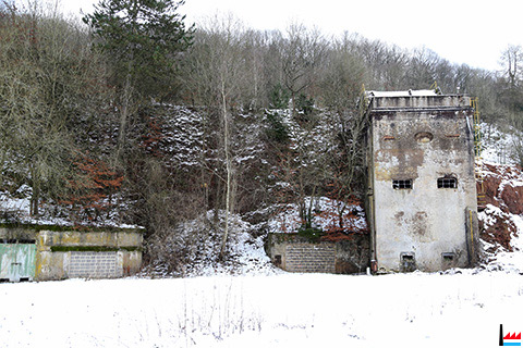 Sand-Silo mit Sandtrockner für die Grubenloks, links Grubeneingänge des Galgenberges (Photos: 30.12.2014 jmo)