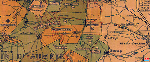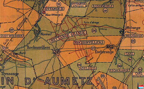 entre les concessions / mines Ottange II, Ottange extension, Rosenmühle, Molvange, Rochonvillers, Angevillers, Ferdinand, Gust. Wiesner extension, Gust. Wiesner
