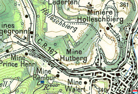 Mine Hutberg, Rumelange - 1927 © Origine Administration du Cadastre et de la Topographie Luxembourg (ACT) - Extrait de la carte topographique à l'échelle 1: 50.000 édition 1927 - Autorisation de publication du 20.10.2010.»