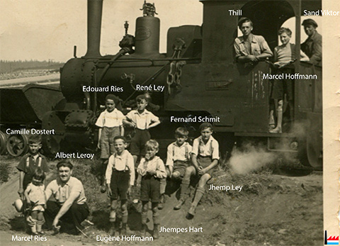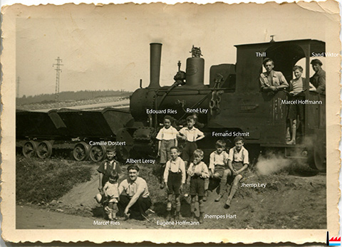 De Michel Ries (gebuer 1901, verstuerwen 1982) ass mäin Urgroussbop, dee Mineur, an (no sengem schwéieren Accident 1928 Maschinist an der Mine Walert zu Rëmeleng, Des Photo ass souwäit ech et noverfolgen konnt am August 1935 gemaach ginn direkt vis-à-vis vum Haus vun der Famill Ries an der rue Notre Dame, Kayl 49°29'04.3"N 6°01'43.3"E. Ubai och d'Nimm vun den Leit op der Foto. Den Michel Ries huet zwee Kanner, den Marcel Ries ass mäin Bop an säin Brudder den Edi, béid liewen och nach ëmmer zu Kayl. (Info: Serge Ecker)