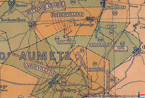 entre les concessions / mines Hettange-Grande, Molvange, Carl, Escherange, Adelheid, Angevillers