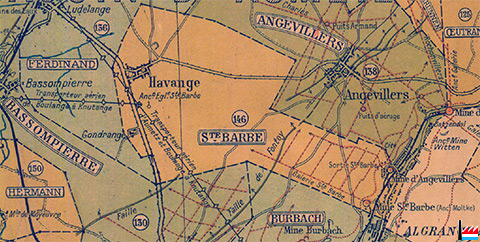 entre les concessions / mines Angevillers (138), Burbach (148), Havange (130), Ferdinand (136)