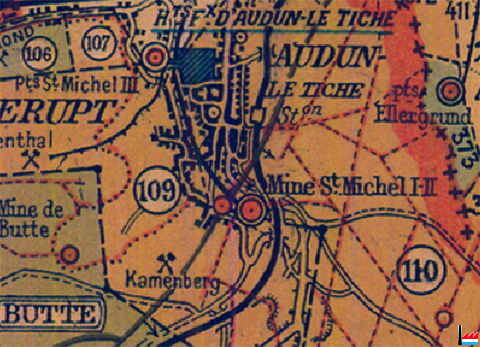 entre les concessions / mines: Friedrich Edmund (106) - Schmitgen (107) - Mont-Rouge (110) - Franz (133) - Aumetz (128) - Butte (108) - Cantebonne (21)