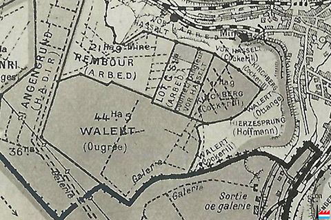 La concession "Walert" (44 ha 50 ares) a été accordée à la Société des Hauts Fourneaux de Rodange Exploitation par Hoffmann et Cie pour le compte de l'Usine de Rodange |