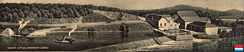 Usine électro-hydraulique (Centrale électrique) et dragage à Erpeldange (Extrait d'une gravure: Eckert & Pflug, Kunstanstalt Leipzig, collection: Serge Kugener)