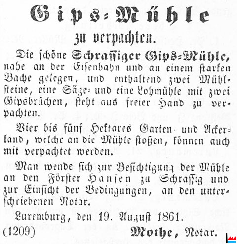 | 1861 | Schrassiger Gipsmühle zu verpachten (LW: 22.8.1861) |