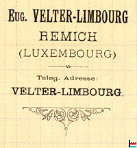 Gerbereien: (…), Velter-Limbourg (Dpfbtr.). Landw. Lokal-Ackerbauverein: Präsident Velter-Altwies W. Lederhandlungen: (…), Velter-Limburg. Lohmühle: Velter-Limburg. Weingutsbesitzer: (…), Velter-Limburg. |