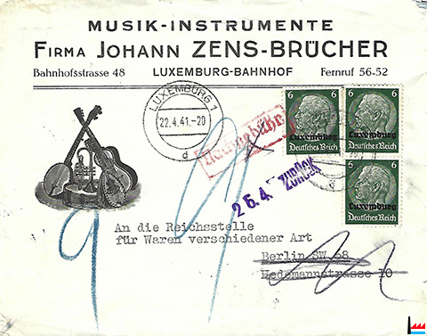 22.4.1941 - Musik-Instrumente Firma Johann Zens-Brücher, Luxemburg-Bahnhof, 48 Bahnhofsstraße - Enveloppe à entête. (Collection Claude Reisch, Luxembourg)