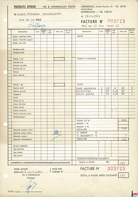 Produits EPIDOR - Nei- et Nonnenmillen Réunis, Echternach- Facture à Boulangerie J. Schanen, Schifflange, rue de la Paix (Collection: Michèle Schanen)