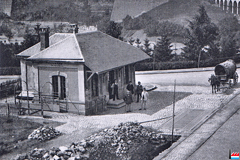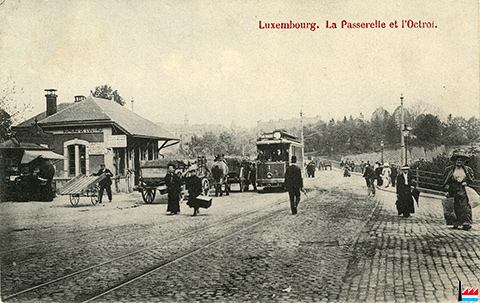 Luxembourg - Entrée de la Ville - aubette d’octroi avec balance - à la droite la passerelle au fond les casernes du Saint Esprit - Octroishaischen mat Wo - Oktroibureau mit Waage - das normalspurige Gleis (1,435 m) der Pferdebahn (1875 - 1908) über die Passerelle in Richtung Oberstadt (~ 1900 Photographe inconnu, Collection Jean Esch © Photothèque VDL)