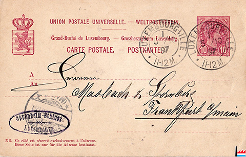 | 1.1915 | ![]() Mechanische Herrenkleiderfabrik Oppenheim-Schloss, Luxemburg. tél: 825 (Collection: Serge Kugener) Auslandstelle Trier - Freigegeben |