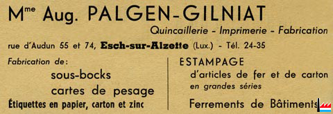 | 1962 | Palgen - Gilniat imprimerie, cartonnages, art. d'estampage 74 rue d'Audun, Esch/Alzette Tél: 524 35 |