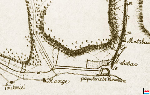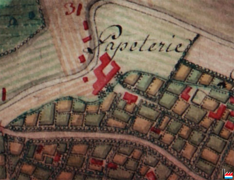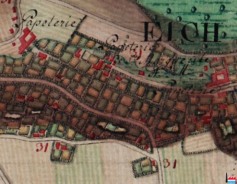 3 papeteries à Mühlenbach/Eich: Garnier / Lamort - Lapayrade - Loutz - 1777 (Carte de Ferraris - Bibliothèque royale de Belgique - 2010)
