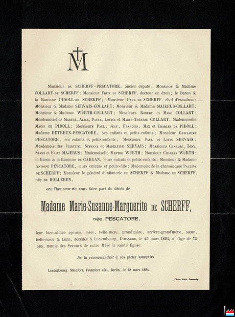| 25.3.1894 | ![]() Faire-part du décès de Madame Marie Susanne Marguerite de Scherff, née Pescatore, à l'âge de 75 ans à Luxembourg (Collection: industrie.lu) |