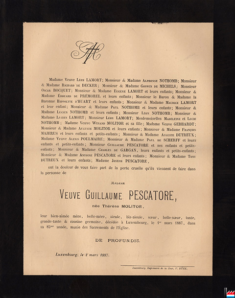 Faire-part du décès de la Veuve Guillaume Pescatore, née Thérèse Molitor - 2.3.1887 (Collection industrie.lu)