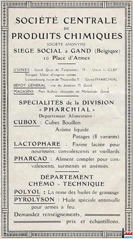 | <=1922 | Société Centrale de Produits Chimiques S.A. siège social à Gand (Belgique) - 10 place d'Armes - Belgique Usines: Gand, quai de Terplaeten 78 - Usine la CLEF Elouges, Usine d'engrais azotés Luxembourg, route de Thionville 71 - Usine Pharchial |