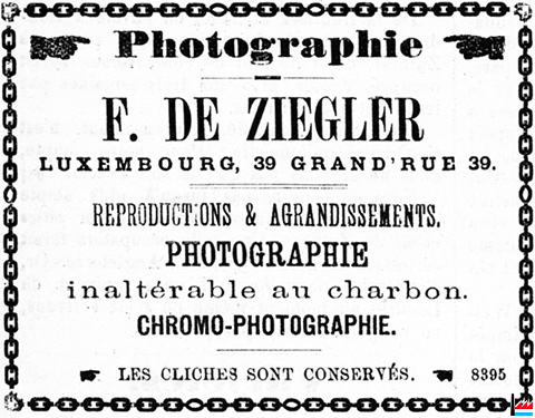 | <=1893 | Bebing Nic., Diekirch, photographe Bernhoeft Charles, photographe, Luxembourg, 1 rue du Génie Deleidernier F., photographe, Mondorf Dell N., photographe, Troisvierges Kuhn Dominique, photographe, Luxembourg, 7 rue des Capucins Maroldt Nic., Diekirch, photographe et vitrier Primavesi A., Luxembourg-Gare Reyland Nic., Larochette Schütz Pierre, photographe, Luxembourg, 31 avenue de la Gare Thill (?) Emile, Echternach (= E. Thiel-Pinnel, Echternach ?) |