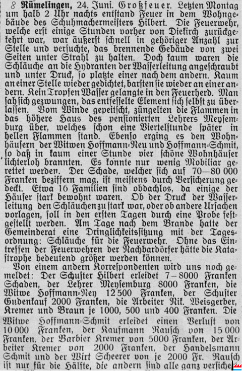 | 186x | Der Grossteil der der Witwe Charles Bech gehörenden Gerberei wurde eingeäschert. | ||