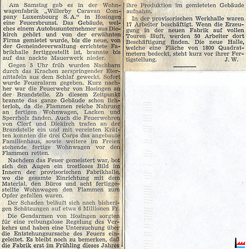 | 3.10.1964 | ![]() ![]() Feuersbrunst in der angemieteten provisorischen Fabrikhalle der Willerby, Hosingen (LW: 5.10.1964 p. 6; Scan: Fernand Toussaint) |