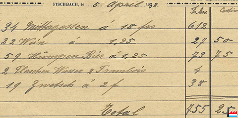 | 1.1949 | ![]() Elektrizitätswerk Hobscheid, Michel Gillet - Rechnung (Collection: industrie.lu) Verbrauch: 107 kwh: 438,70 fr Zählermiete: 7 fr Umsatzsteuer: 8,90 fr |