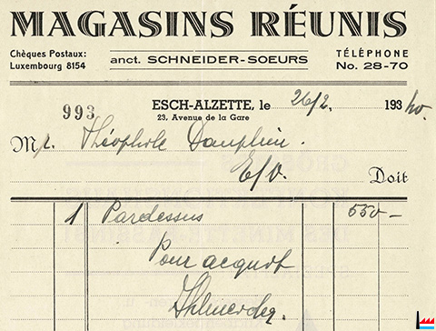 | 26.2.1940 | ![]() Magasins Réunis, anct. Schneider soeurs, Esch/Alzette, 23 avenue de la Gare, tél: 2870 - facture pour 1 Pardessus: 550 fr (Collection: industrie.lu) |