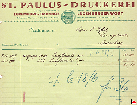 | 1928 | ![]() St. Paulus-Druckerei A.G., Luxemburg-Bahnhof - Verlag des Luxemburger Wort - Rechnung 1928 an Beffort, Chimaystrasse, Luxemburg (Collection: industrie.lu) ![]() Anzeige N° 8162 im LW - Prix: 36 fr: Laufbursche gesucht - Druckerei V. Beffort, 10 Chimaystrasse, Luxemburg (LW: 28.4.1928) |
