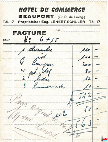 | 7.1956 | ![]() Hôtel du Commerce, Beaufort - facture du 16.7.1956 (Collection industrie.lu) Propr. Eug. Lenert - Schuler, tél: 17 1 chambre: 110 fr 1 chambre: 100 fr 4 ?: 200 fr 4 petits-déjeuners: 80 fr 2 bières: 12 fr 2 limonades: 10 fr 10% |