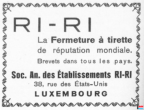 | En 1970, le groupe RiRi entre dans les girons de Talon Atlantic, division du Groupe Textron (connu e.a. par les hélicoptères " Bell", les stylos "Sheaffer", les agrafeuses " Bostitch"); le 14 août 1975 la raison sociale de la société est changée en Talon S.A. Peu après le groupe américain décide de rationaliser le réseau européen de l'ancienne société RiRi et d'arrêter la production dans l'usine luxembourgeoise qui fut transformée en un centre de distribution. Depuis 1976 Talon S.A. ne fait plus partie de l'industrie mais du commerce. | |||