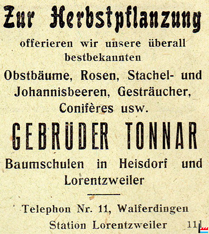 Gebrüder Tonnar - Baumschulen in Heisdorf und Lorentzweiler - 1928 (In "Le Coin de Terre et le Foyer" Nr.12 Dezember 1928 1. Jahrgang - Collection: industrie.lu)