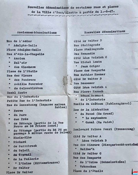 Nouvelles dénominations de certaines rues et places de la Ville d'Esch/Alzette à partir du 1.6.1947 (Collection: Greenwood-Hamilius)