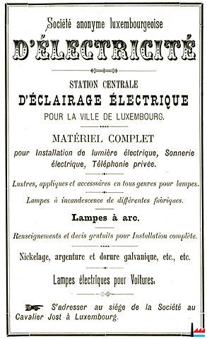 | 1.9.1888 | Eine Siemens Dynamomaschine den ersten elektrischen Strom in der Stadt Luxemburg. Sie war im ehemaligen Festungswerk Cavalier Jost installiert und wurde durch eine kleine Dampfmaschine angetrieben. Es gab damals 5 Abonnenten welche im Monat September für 78 Franken Strom abnahmen. |