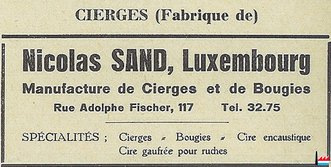 | 1931, 1953 | Fabrique de cierges et de bougies Sand Nicolas, succ. Joseph Sand 117 rue Adolphe Fischer |