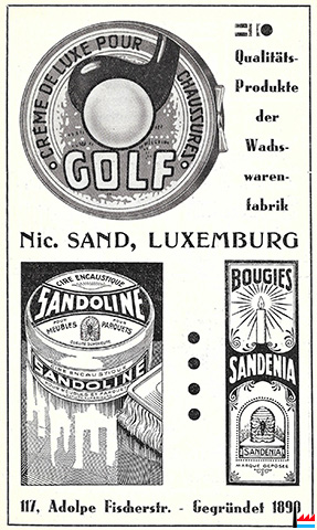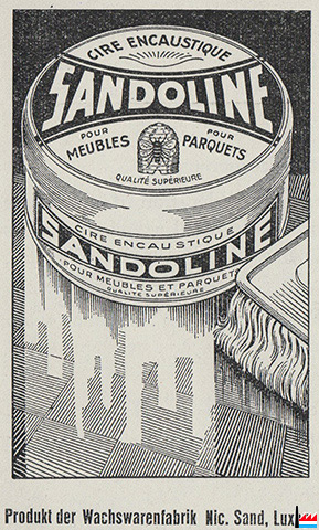 Sand, Wachswarenfabrikant zu Hollerich. Die Marke stellt im Wesentlichen das Wort «Sandalin» dar, sowie die Abbildung einer Biene. Sie wird in allen Größen und Farben und auf jede beliebige Art und Weise angewandt auf Schuhcrême, Parkettwachs, Wachskerzen, Ofenglanz, Lederfett und Wachsschnur. |