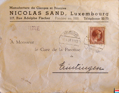 Manufacture d'articles en cire Nicolas SAND, Luxembourg (Enveloppe - Briefumschlag - 11.4.1938; Collection: industrie.lu)