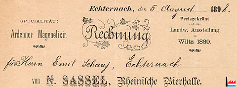 | 1889 | Nicolas Sassel, Rheinische Bierhalle Spezialität: Ardenner Magenelixir Preisgekrönt auf der Landwirtschaftlichen Ausstellung in Wiltz 1889 |