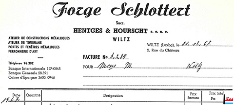| <=1967 | ![]() Forge Schlottert - Succ. HENTGES & HOURSCHT s. e. n. c., 2, rue du Château, Wiltz, Luxembourg, Téléphone 96 382 - Atelier de construction métalliques - Atelier de tournage - Portes et fenêtres métalliques - Ferronnerie d’art. - Facture du 31.12.1967. (Collection Philippe Aschman) |