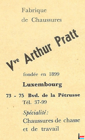 | 1.4.1920 | ![]() Au Lion d'Or, Luxemburg, Königinstraße 4 (vormals ROMEO) gegenüber jetzigem Geschäft, Vve Arthur Pratt, Schuhfabrik, Luxemburg (LW. 25.3.1920) |