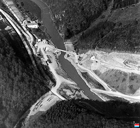 Bau der SEO - Staumauer des Unterbeckens in Vianden, vorne rechts die Lohmühle - 1961 (Photo: Archive SEO)