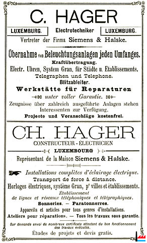 | 1890 | Die Firma Bartels & Hager übernimmt die Siemens & Halske - Vertretung für Luxemburg | ||