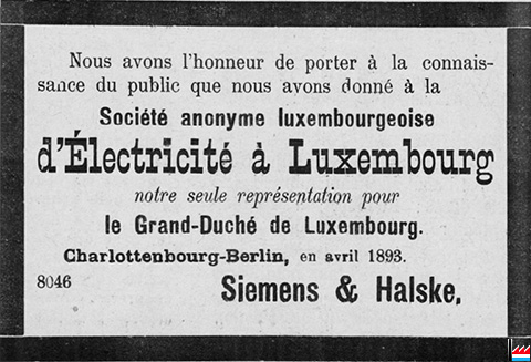 Société anonyme luxembourgeoise d’Électricité à Luxembourg notre seule représentation pour le Grand-Duché de Luxembourg. Charlottenbourg-Berlin, en avril 1893. Siemens & Halske. (LIL: 3.8.1893) |