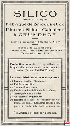 | 1922 | Production annuelle: 3,5 millions de briques Briques (dimensions: 250 x 120 x 65 mm) soumises pendant 10 heures au moins à une pression de vapeur de 8 atm Le sable provient de la carrière Trierweiler (anciennement Jean Lehnert)