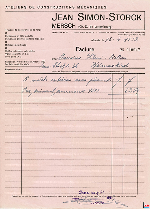 | 1952 | ![]() Ateliers de constructions mécaniques Jean Simon-Storck, Mersch - facture du 15.4.1952 (Collection: industrie.lu) tél : 10 |