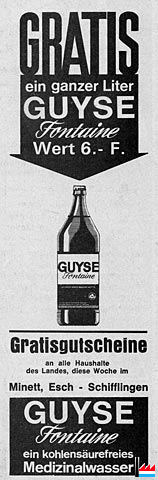 | 1973 | Während des extrem heißen Sommers explodieren die Verkaufszahlen. Die 100 cl Flaschen des stillen Wassers Guyse Fontaine werden mit Sprudelwasser befüllt um der immens großen Nachfrage gerecht zu werden. Auch die Piccoloflasche wird jetzt im Plastikkasten verkauft. |