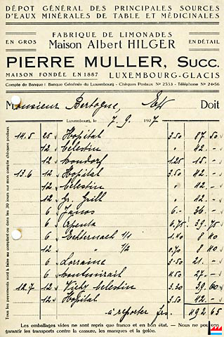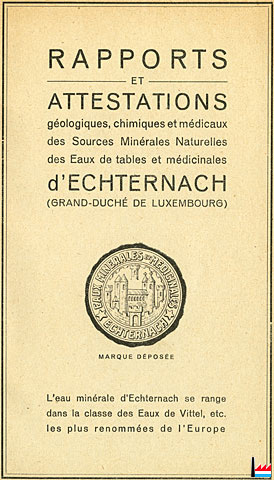 | 29.11.1924 | Société des Eaux Minérales d'Echternach S.A. Fondation par / Gründung durch: Jean Simon - Bailleux Capital: 1.600.000 LUF représenté par 3200 actions de 500 LUF chacune an der Straße Echternach - Rodenhof, im Ort genannt "Lütschen" |
