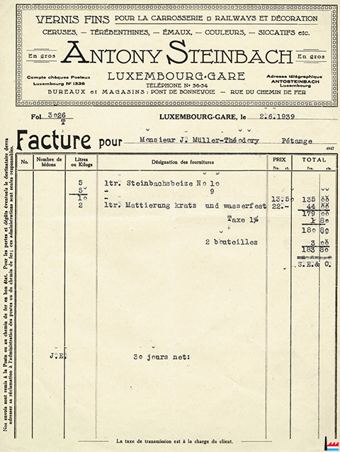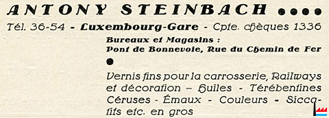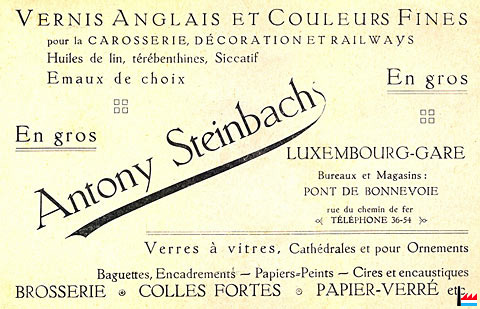 | Antony Steinbach fils, Luxembourg rue de Bonnevoie, 9 Epicerie et représentations commerciales. Exploitant : Antony Jean-Aurélien Steinbach, Luxembourg. (Registre aux firmes N° 1096 - Du 27 septembre 1910) Antony Steinbach père, Luxembourg avenue de la Faïencerie Epicerie et représentations commerciales. Exploitant : Antony Steinbach père, Luxembourg. (Registre aux firmes N° 1097 - Du 27 septembre 1910) |
