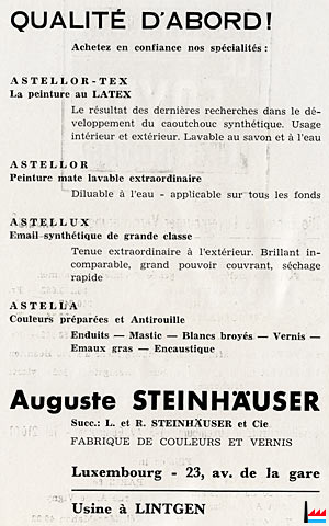 | <=1976 | Fabrique de couleurs et vernis Lucien Steinhäuser, Lintgen, 28 rue de Diekirch, tél: 32412 |