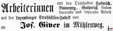 | 1898 | Wegen Einstellung Luxemburger Strohhülsen-Fabrik (LW: 1.6.1898) |