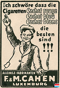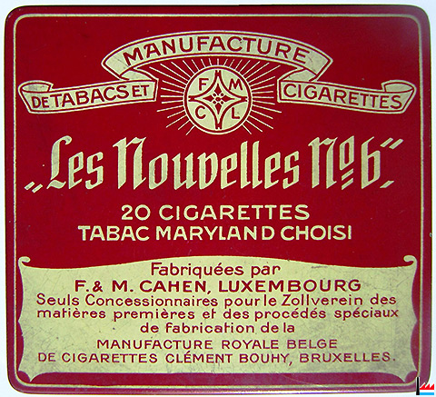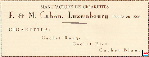 | <=1935 | Königlich-Belgische Zigarettenmanufaktur, succ. de Luxembourg, F. & M. Cahen 4 rue Wallis, Luxembourg |