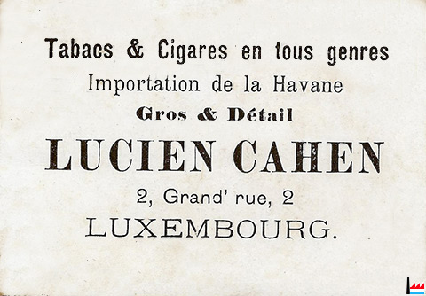 Tabacs & Cigares en tous genres. Importation de la Havane. Gros & Détail. Lucien Cahen 2, Grand’rue Luxembourg.